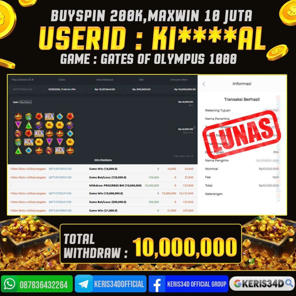 KERIS34D dikenal sebagai situs terpercaya yang selalu menghadirkan pengalaman bermain slot online yang aman, fair, dan berlisensi resmi. Di sini, kami tidak hanya sekadar memberikan janji, tapi bukti nyata berupa slip kemenangan yang dapat Anda lihat secara langsung.