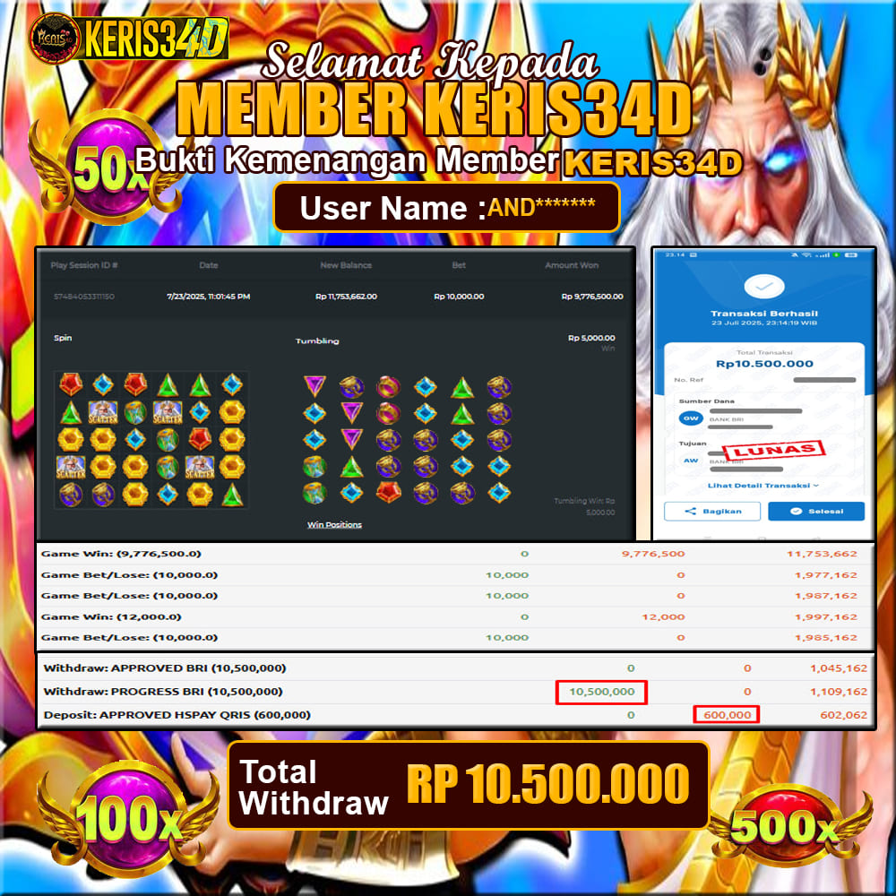 Setiap hari, member KERIS34D berhasil meraih jackpot besar dari berbagai provider slot ternama yang kami sediakan, seperti Pragmatic Play, Habanero, PG Soft, dan masih banyak lagi. Kami secara rutin menampilkan bukti screenshot atau rekapan kemenangan yang berhasil diraih, mulai dari kemenangan ratusan ribu hingga puluhan juta rupiah. Semua slip kemenangan ini kami hadirkan untuk membuktikan bahwa di KERIS34D, peluang menang itu nyata