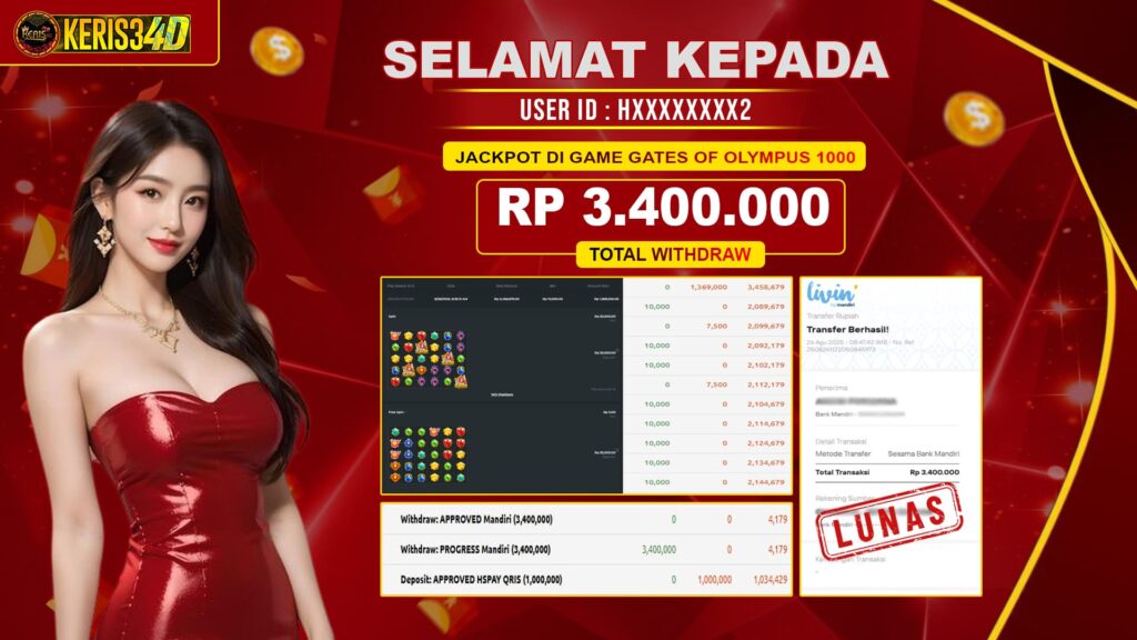 Setiap hari, member KERIS34D berhasil meraih jackpot besar dari berbagai provider slot ternama yang kami sediakan, seperti Pragmatic Play, Habanero, PG Soft, dan masih banyak lagi. Kami secara rutin menampilkan bukti screenshot atau rekapan kemenangan yang berhasil diraih, mulai dari kemenangan ratusan ribu hingga puluhan juta rupiah. Semua slip kemenangan ini kami hadirkan untuk membuktikan bahwa di KERIS34D, peluang menang itu nyata