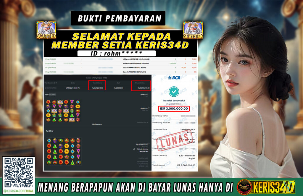 KERIS34D dikenal sebagai situs terpercaya yang selalu menghadirkan pengalaman bermain slot online yang aman, fair, dan berlisensi resmi. Di sini, kami tidak hanya sekadar memberikan janji, tapi bukti nyata berupa slip kemenangan yang dapat Anda lihat secara langsung.