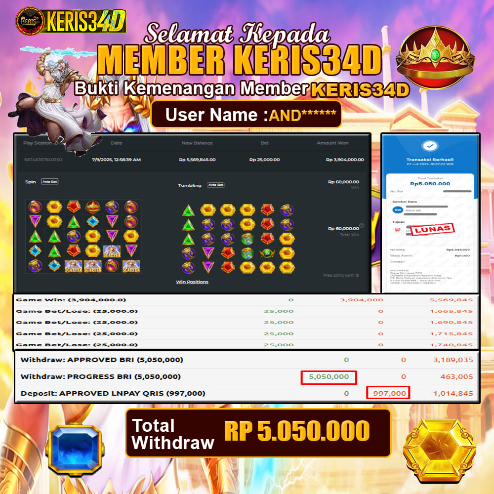 KERIS34D dikenal sebagai situs terpercaya yang selalu menghadirkan pengalaman bermain slot online yang aman, fair, dan berlisensi resmi. Di sini, kami tidak hanya sekadar memberikan janji, tapi bukti nyata berupa slip kemenangan yang dapat Anda lihat secara langsung.