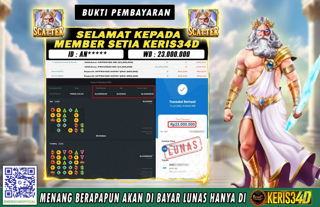 KERIS34D dikenal sebagai situs terpercaya yang selalu menghadirkan pengalaman bermain slot online yang aman, fair, dan berlisensi resmi. Di sini, kami tidak hanya sekadar memberikan janji, tapi bukti nyata berupa slip kemenangan yang dapat Anda lihat secara langsung.