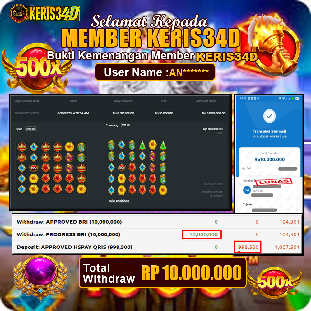 SSetiap hari, member KERIS34D berhasil meraih jackpot besar dari berbagai provider slot ternama yang kami sediakan, seperti Pragmatic Play, Habanero, PG Soft, dan masih banyak lagi. Kami secara rutin menampilkan bukti screenshot atau rekapan kemenangan yang berhasil diraih, mulai dari kemenangan ratusan ribu hingga puluhan juta rupiah. Semua slip kemenangan ini kami hadirkan untuk membuktikan bahwa di KERIS34D peluang menang itu nyata