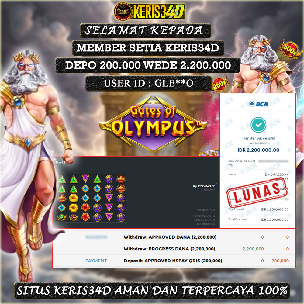Setiap hari, member KERIS34D berhasil meraih jackpot besar dari berbagai provider slot ternama yang kami sediakan, seperti Pragmatic Play, Habanero, PG Soft, dan masih banyak lagi. Kami secara rutin menampilkan bukti screenshot atau rekapan kemenangan yang berhasil diraih, mulai dari kemenangan ratusan ribu hingga puluhan juta rupiah. Semua slip kemenangan ini kami hadirkan untuk membuktikan bahwa di KERIS34D, peluang menang itu nyata