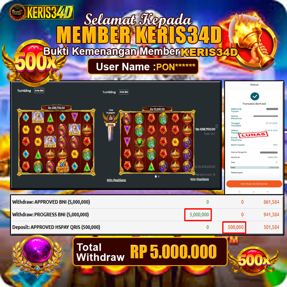 Setiap hari, member KERIS34D berhasil meraih jackpot besar dari berbagai provider slot ternama yang kami sediakan, seperti Pragmatic Play, Habanero, PG Soft, dan masih banyak lagi. Kami secara rutin menampilkan bukti screenshot atau rekapan kemenangan yang berhasil diraih, mulai dari kemenangan ratusan ribu hingga puluhan juta rupiah. Semua slip kemenangan ini kami hadirkan untuk membuktikan bahwa di KERIS34D peluang menang itu nyata
