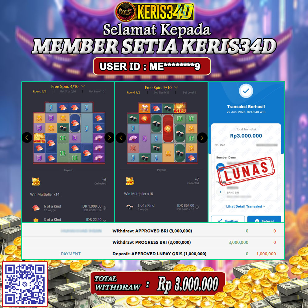 Setiap hari, member KERIS34D berhasil meraih jackpot besar dari berbagai provider slot ternama yang kami sediakan, seperti Pragmatic Play, Habanero, PG Soft, dan masih banyak lagi. Kami secara rutin menampilkan bukti screenshot atau rekapan kemenangan yang berhasil diraih, mulai dari kemenangan ratusan ribu hingga puluhan juta rupiah. Semua slip kemenangan ini kami hadirkan untuk membuktikan bahwa di KERIS34D, peluang menang itu nyata