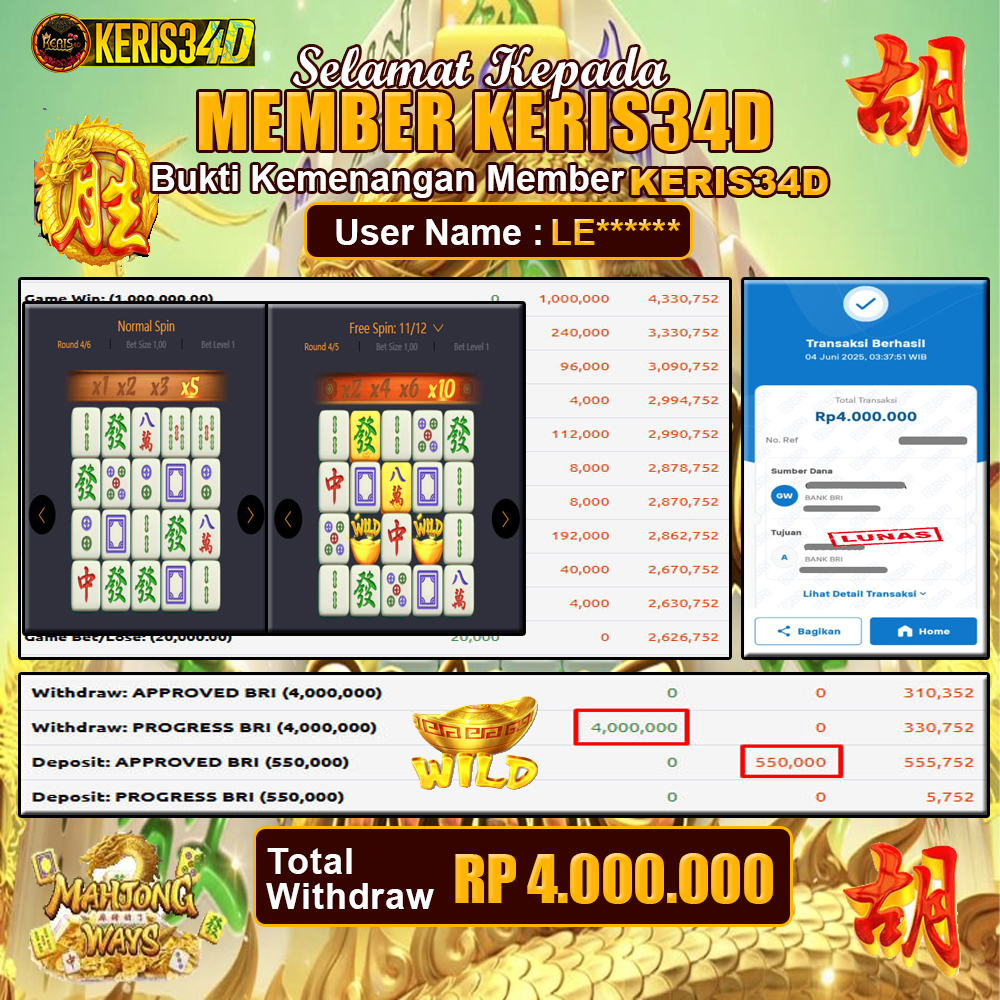 Setiap hari, member KERIS34D berhasil meraih jackpot besar dari berbagai provider slot ternama yang kami sediakan, seperti Pragmatic Play, Habanero, PG Soft, dan masih banyak lagi. Kami secara rutin menampilkan bukti screenshot atau rekapan kemenangan yang berhasil diraih, mulai dari kemenangan ratusan ribu hingga puluhan juta rupiah. Semua slip kemenangan ini kami hadirkan untuk membuktikan bahwa di KERIS34D, peluang menang itu nyata