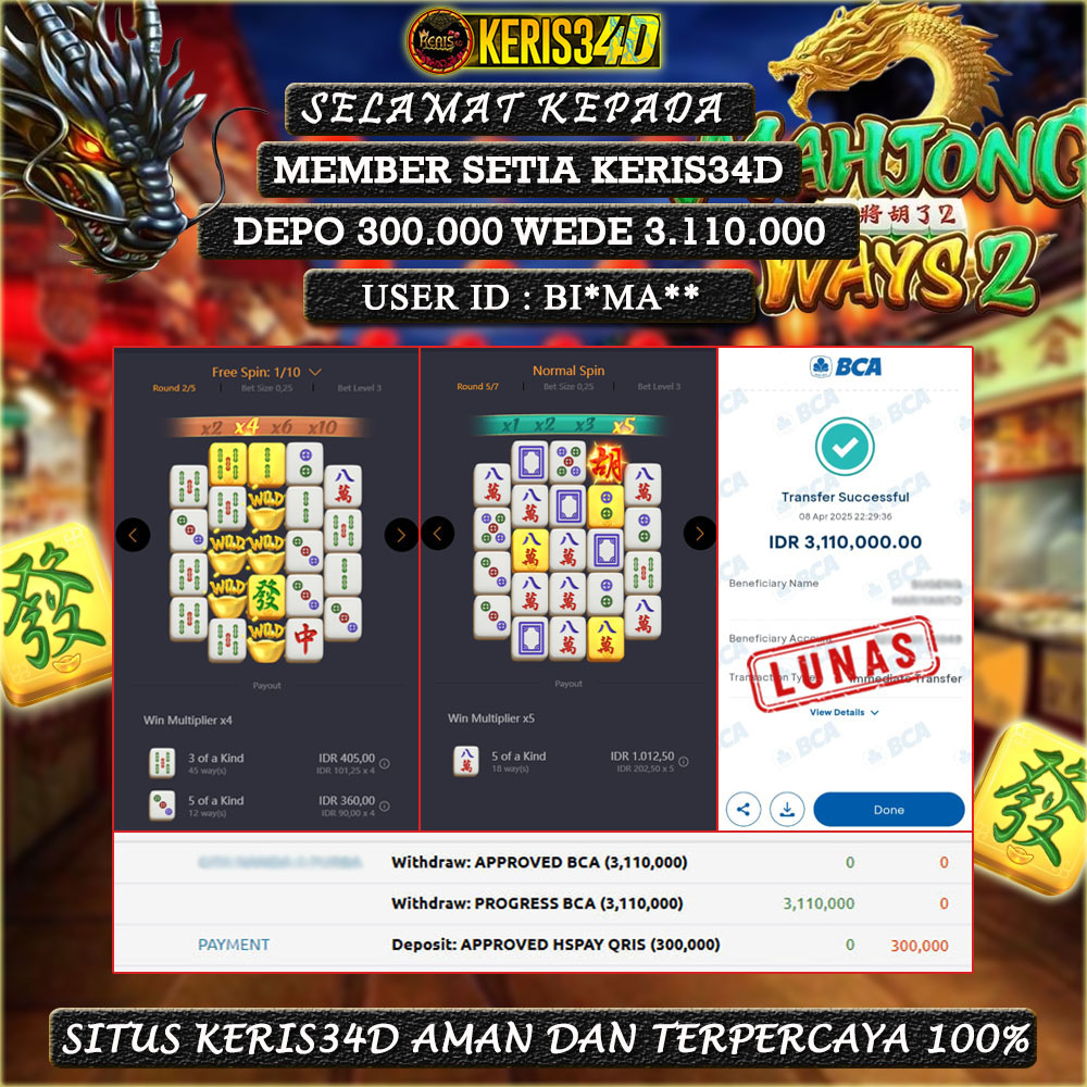 Setiap hari, member KERIS34D berhasil meraih jackpot besar dari berbagai provider slot ternama yang kami sediakan, seperti Pragmatic Play, Habanero, PG Soft, dan masih banyak lagi. Kami secara rutin menampilkan bukti screenshot atau rekapan kemenangan yang berhasil diraih, mulai dari kemenangan ratusan ribu hingga puluhan juta rupiah. Semua slip kemenangan ini kami hadirkan untuk membuktikan bahwa di KERIS34D, peluang menang itu nyata
