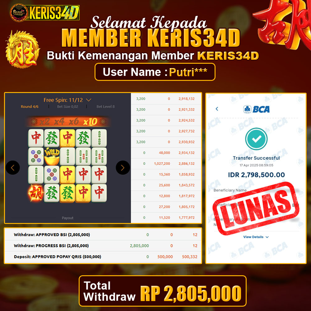 Setiap hari, member KERIS34D berhasil meraih jackpot besar dari berbagai provider slot ternama yang kami sediakan, seperti Pragmatic Play, Habanero, PG Soft, dan masih banyak lagi. Kami secara rutin menampilkan bukti screenshot atau rekapan kemenangan yang berhasil diraih, mulai dari kemenangan ratusan ribu hingga puluhan juta rupiah. Semua slip kemenangan ini kami hadirkan untuk membuktikan bahwa di KERIS34D, peluang menang itu nyata