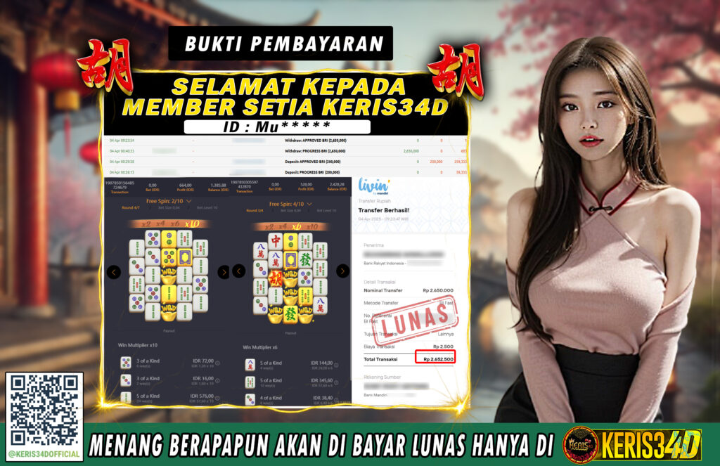 Setiap hari, member KERIS34D berhasil meraih jackpot besar dari berbagai provider slot ternama yang kami sediakan, seperti Pragmatic Play, Habanero, PG Soft, dan masih banyak lagi. Kami secara rutin menampilkan bukti screenshot atau rekapan kemenangan yang berhasil diraih, mulai dari kemenangan ratusan ribu hingga puluhan juta rupiah. Semua slip kemenangan ini kami hadirkan untuk membuktikan bahwa di KERIS34D, peluang menang itu nyata