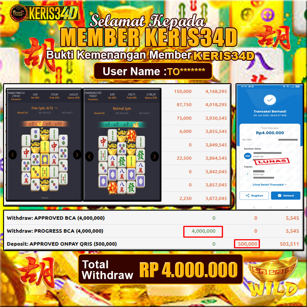 Setiap hari, member KERIS34D berhasil meraih jackpot besar dari berbagai provider slot ternama yang kami sediakan, seperti Pragmatic Play, Habanero, PG Soft, dan masih banyak lagi. Kami secara rutin menampilkan bukti screenshot atau rekapan kemenangan yang berhasil diraih, mulai dari kemenangan ratusan ribu hingga puluhan juta rupiah. Semua slip kemenangan ini kami hadirkan untuk membuktikan bahwa di KERIS34D, peluang menang itu nyata