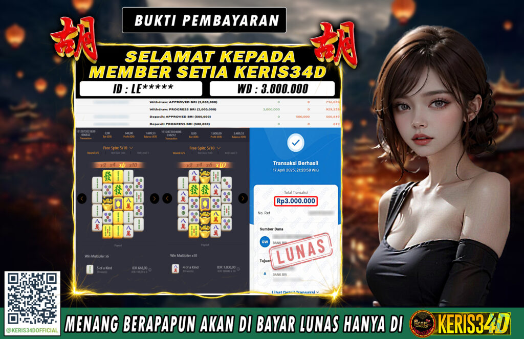 Setiap hari, member KERIS34D berhasil meraih jackpot besar dari berbagai provider slot ternama yang kami sediakan, seperti Pragmatic Play, Habanero, PG Soft, dan masih banyak lagi. Kami secara rutin menampilkan bukti screenshot atau rekapan kemenangan yang berhasil diraih, mulai dari kemenangan ratusan ribu hingga puluhan juta rupiah. Semua slip kemenangan ini kami hadirkan untuk membuktikan bahwa di KERIS34D, peluang menang itu nyata