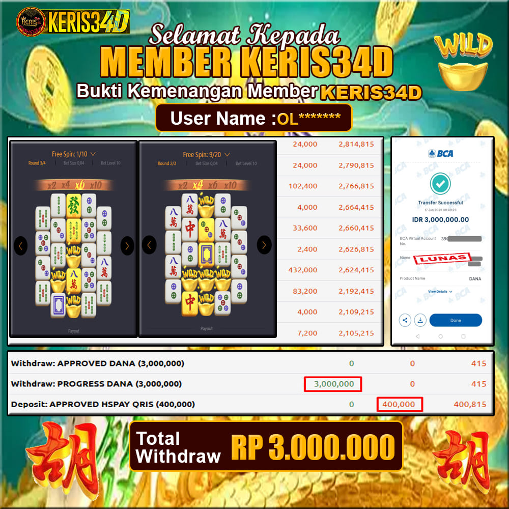 Setiap hari, member KERIS34D berhasil meraih jackpot besar dari berbagai provider slot ternama yang kami sediakan, seperti Pragmatic Play, Habanero, PG Soft, dan masih banyak lagi. Kami secara rutin menampilkan bukti screenshot atau rekapan kemenangan yang berhasil diraih, mulai dari kemenangan ratusan ribu hingga puluhan juta rupiah. Semua slip kemenangan ini kami hadirkan untuk membuktikan bahwa di KERIS34D, peluang menang itu nyata