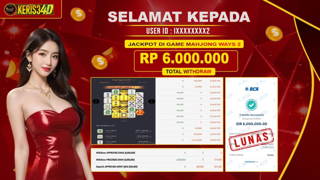 KERIS34D dikenal sebagai situs terpercaya yang selalu menghadirkan pengalaman bermain slot online yang aman, fair, dan berlisensi resmi. Di sini, kami tidak hanya sekadar memberikan janji, tapi bukti nyata berupa slip kemenangan yang dapat Anda lihat secara langsung.