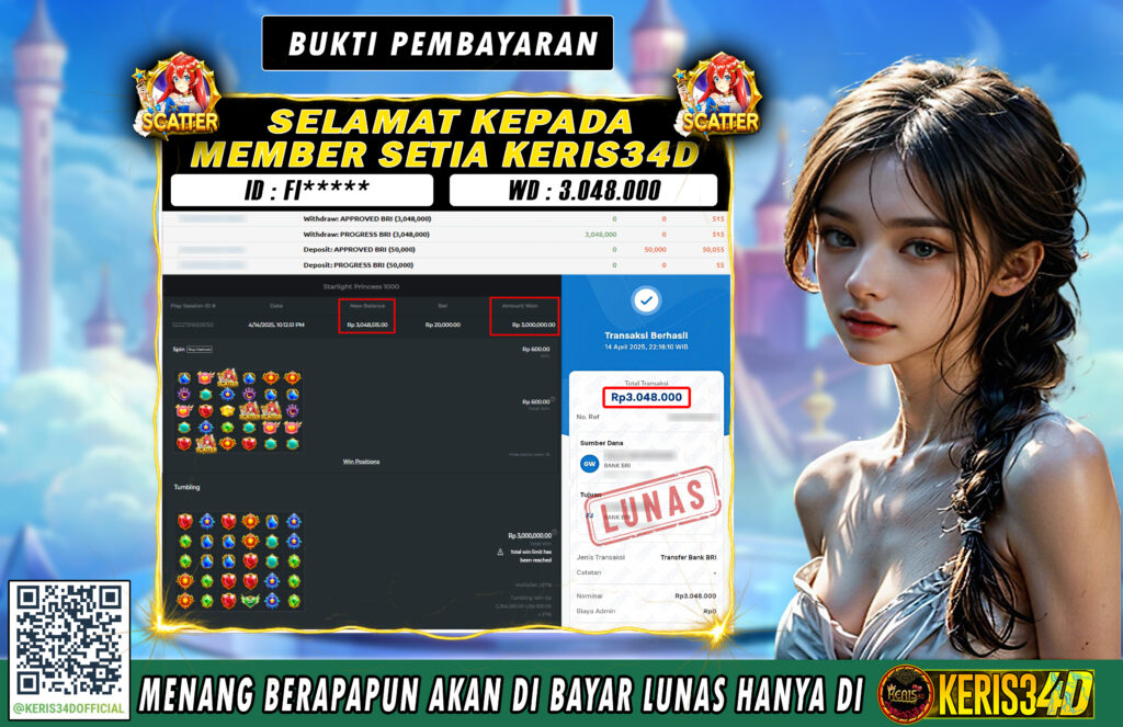 Setiap hari, member KERIS34D berhasil meraih jackpot besar dari berbagai provider slot ternama yang kami sediakan, seperti Pragmatic Play, Habanero, PG Soft, dan masih banyak lagi. Kami secara rutin menampilkan bukti screenshot atau rekapan kemenangan yang berhasil diraih, mulai dari kemenangan ratusan ribu hingga puluhan juta rupiah. Semua slip kemenangan ini kami hadirkan untuk membuktikan bahwa di KERIS34D, peluang menang itu nyata