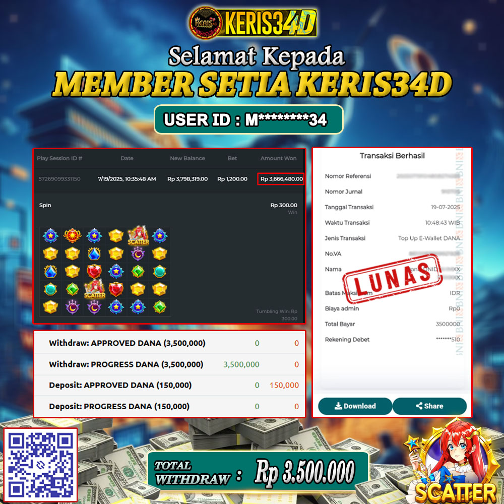 Setiap hari, member KERIS34D berhasil meraih jackpot besar dari berbagai provider slot ternama yang kami sediakan, seperti Pragmatic Play, Habanero, PG Soft, dan masih banyak lagi. Kami secara rutin menampilkan bukti screenshot atau rekapan kemenangan yang berhasil diraih, mulai dari kemenangan ratusan ribu hingga puluhan juta rupiah. Semua slip kemenangan ini kami hadirkan untuk membuktikan bahwa di KERIS34D, peluang menang itu nyata