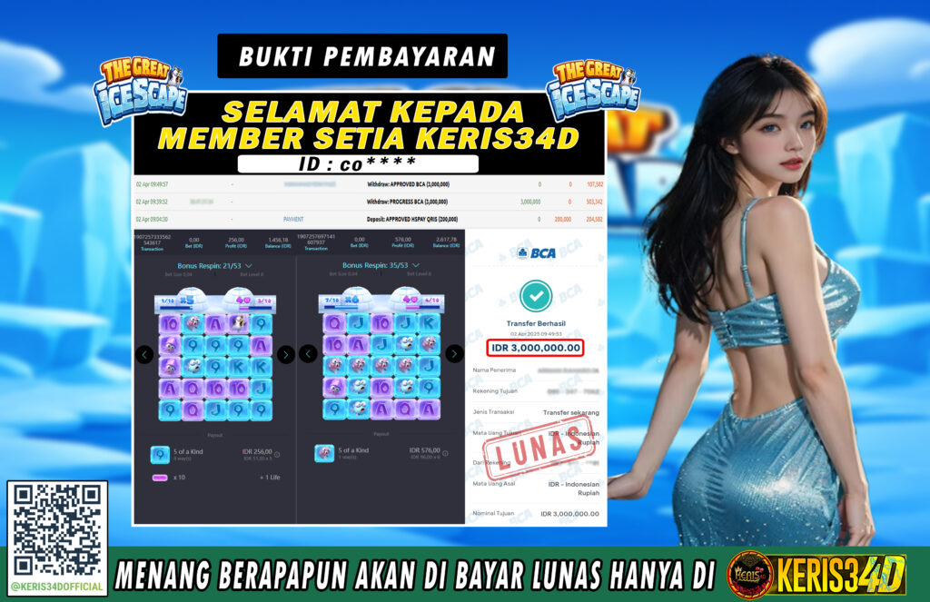 Setiap hari, member KERIS34D berhasil meraih jackpot besar dari berbagai provider slot ternama yang kami sediakan, seperti Pragmatic Play, Habanero, PG Soft, dan masih banyak lagi. Kami secara rutin menampilkan bukti screenshot atau rekapan kemenangan yang berhasil diraih, mulai dari kemenangan ratusan ribu hingga puluhan juta rupiah. Semua slip kemenangan ini kami hadirkan untuk membuktikan bahwa di KERIS34D, peluang menang itu nyata