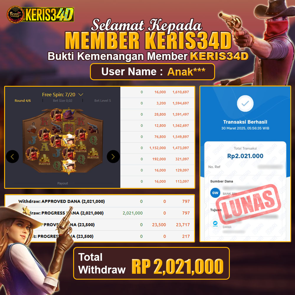 Setiap hari, member KERIS34D berhasil meraih jackpot besar dari berbagai provider slot ternama yang kami sediakan, seperti Pragmatic Play, Habanero, PG Soft, dan masih banyak lagi. Kami secara rutin menampilkan bukti screenshot atau rekapan kemenangan yang berhasil diraih, mulai dari kemenangan ratusan ribu hingga puluhan juta rupiah. Semua slip kemenangan ini kami hadirkan untuk membuktikan bahwa di KERIS34D, peluang menang itu nyata.