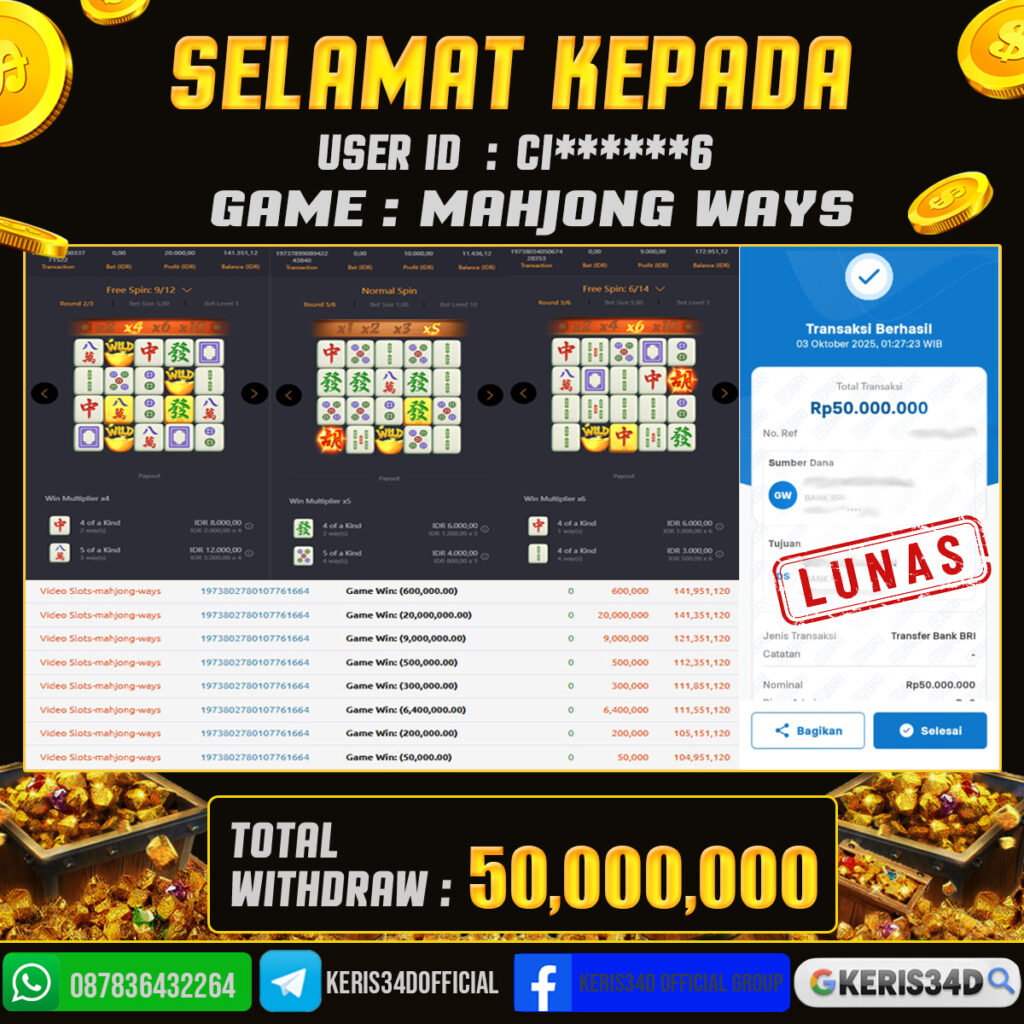 Setiap hari, member KERIS34D berhasil meraih jackpot besar dari berbagai provider slot ternama yang kami sediakan, seperti Pragmatic Play, Habanero, PG Soft, dan masih banyak lagi. Kami secara rutin menampilkan bukti screenshot atau rekapan kemenangan yang berhasil diraih, mulai dari kemenangan ratusan ribu hingga puluhan juta rupiah. Semua slip kemenangan ini kami hadirkan untuk membuktikan bahwa di KERIS34D, peluang menang itu nyata